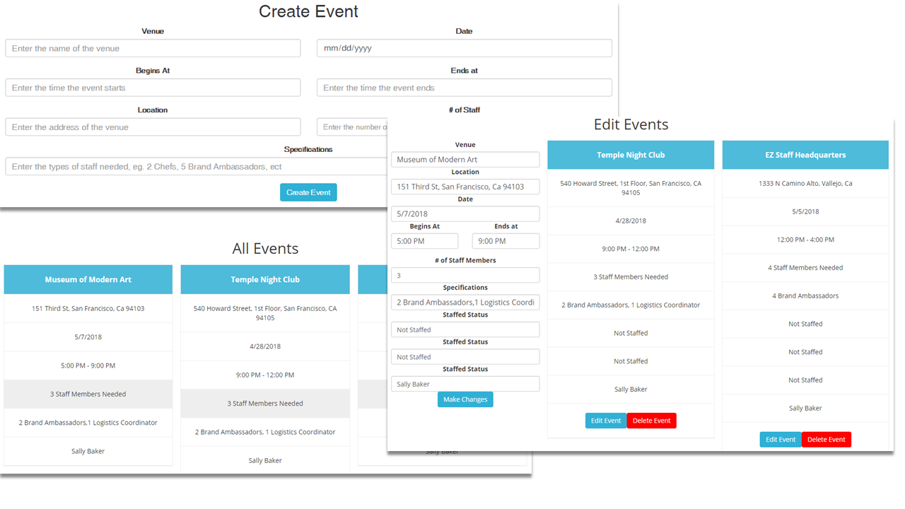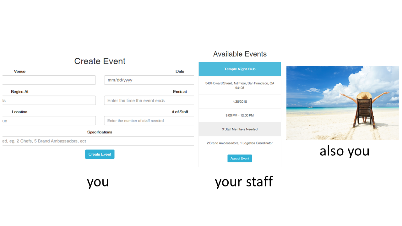 This was created as a low cost alternative to having to call/email staff members to inquire about their availability. This was created so that the actual process of staffing doesn't take up all of your time, so that you're free to do more productive things. This was created so that you don't have to call staff members at the time of the event to make sure they've arrived on time.